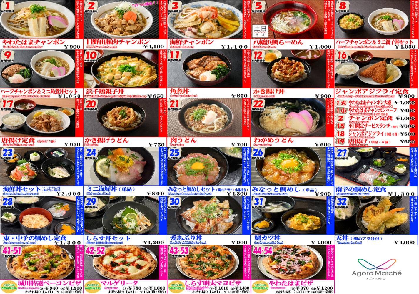 鶏ガラベースのあっさりとしながらも野菜の旨みを感じられるスープに、中太麺とたっぷりの具材を盛り付けた麺料理。アゴラマルシェではベーシックな「八幡浜ちゃんぽん」の他、「海鮮ちゃんぽん」や「日野出豚肉ちゃんぽん」など、ここでしか食べられないアレンジちゃんぽんもご用意しております。